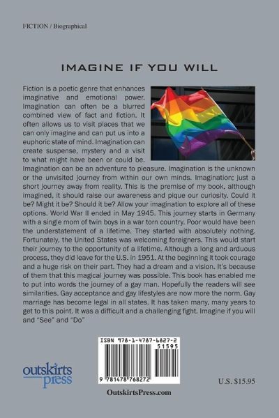 Fiction is a poetic genre that enhances imaginative and emotional power. Imagination often allows us to visit places that we can only imagine and can put us into a euphoric state of mind. Imagination can create suspense, mystery and a visit to what might have been or could be. Imagination can be an adventure to pleasure. Imagination is the unknown or the unvisited journey from within our own minds. Imagination; just a short journey away from reality. This is the premise of my book, although imagined, it should raise our awareness and pique our curiosity. Could it be? Might it be? Should it be? Allow your imagination to explore all of these options. World War II ended in May 1945. This journey starts in Germany with a single mom of twin boys in a war torn country. Poor would have been the understatement of a lifetime. They started with absolutely nothing. Fortunately, the United States was welcoming foreigners. This would start their journey to the opportunity of a lifetime. Although a long and arduous process, they did leave for the U.S. in 1951. At the beginning it took courage and a huge risk on their part. They had a dream and a vision. It¿s because of them that this magical journey was possible. This book has enabled me to put into words the journey of a gay man. Hopefully the readers will see similarities. Gay acceptance and gay lifestyles are now more the norm. Gay marriage has become legal in all states. It has taken many, many years to get to this point. It was a difficult and a challenging fight. Imagine if you will and ¿See¿ and ¿Dö