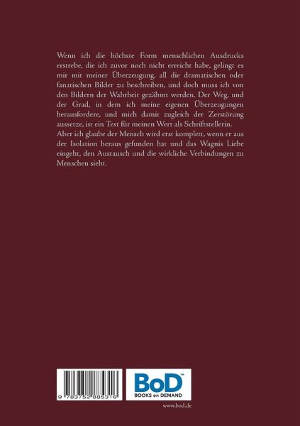 Wenn ich die höchste Form menschlichen Ausdrucks erstrebe, die ich zuvor noch nicht erreicht habe, gelingt es mir mit meiner Überzeugung, all die dramatischen oder fanatischen Bilder zu beschreiben, und doch muss ich von den Bildern der Wahrheit gezähmt werden. Der Weg, und der Grad, in dem ich meine eigenen Überzeugungen herausfordere, und mich damit zugleich der Zerstörung aussetze, ist ein Test für meinen Wert als Schriftstellerin.Aber ich glaube der Mensch wird erst komplett, wenn er aus der Isolation heraus gefunden hat und das Wagnis Liebe eingeht, den Austausch und die wirkliche Verbindungen zu Menschen sieht.