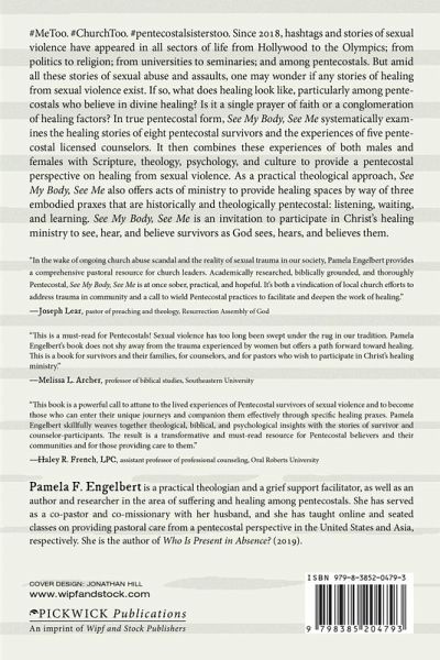#MeToo. #ChurchToo. #pentecostalsisterstoo. Since 2018, hashtags and stories of sexual violence have appeared in all sectors of life from Hollywood to the Olympics; from politics to religion; from universities to seminaries; and among pentecostals. But amid all these stories of sexual abuse and assaults, one may wonder if any stories of healing from sexual violence exist. If so, what does healing look like, particularly among pentecostals who believe in divine healing? Is it a single prayer of faith or a conglomeration of healing factors? In true pentecostal form, See My Body, See Me systematically examines the healing stories of eight pentecostal survivors and the experiences of five pentecostal licensed counselors. It then combines these experiences of both males and females with Scripture, theology, psychology, and culture to provide a pentecostal perspective on healing from sexual violence. As a practical theological approach, See My Body, See Me also offers acts of ministry to provide healing spaces by way of three embodied praxes that are historically and theologically pentecostal: listening, waiting, and learning. See My Body, See Me is an invitation to participate in Christ's healing ministry to see, hear, and believe survivors as God sees, hears, and believes them.