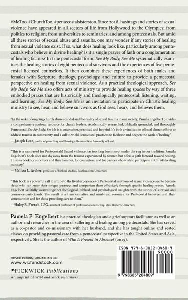 #MeToo. #ChurchToo. #pentecostalsisterstoo. Since 2018, hashtags and stories of sexual violence have appeared in all sectors of life from Hollywood to the Olympics; from politics to religion; from universities to seminaries; and among pentecostals. But amid all these stories of sexual abuse and assaults, one may wonder if any stories of healing from sexual violence exist. If so, what does healing look like, particularly among pentecostals who believe in divine healing? Is it a single prayer of faith or a conglomeration of healing factors? In true pentecostal form, See My Body, See Me systematically examines the healing stories of eight pentecostal survivors and the experiences of five pentecostal licensed counselors. It then combines these experiences of both males and females with Scripture, theology, psychology, and culture to provide a pentecostal perspective on healing from sexual violence. As a practical theological approach, See My Body, See Me also offers acts of ministry to provide healing spaces by way of three embodied praxes that are historically and theologically pentecostal: listening, waiting, and learning. See My Body, See Me is an invitation to participate in Christ's healing ministry to see, hear, and believe survivors as God sees, hears, and believes them.