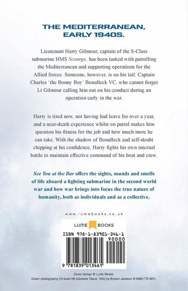 The Mediterranean, early 1940s. Lieutenant Harry Gilmour, captain of the S-Class submarine HMS Scourge, has been tasked with patrolling the Mediterranean and supporting operations for the Allied forces. Someone, however, is on his tail: Captain Charles 'the Bonny Boy' Bonalleck VC, who cannot forget Lt Gilmour calling him out on his conduct during an operation early in the war. Harry is tired now, not having had leave for over a year, and a near-death experience whilst on patrol makes him question his fitness for the job and how much more he can take. With the shadow of Bonalleck and self-doubt chipping at his confidence, Harry fights his own internal battle to maintain effective command of his boat and crew. See You at the Bar offers the sights, sounds and smells of life aboard a fighting submarine in the second world war and how war brings into focus the true nature of humanity, both as individuals and as a collective.
