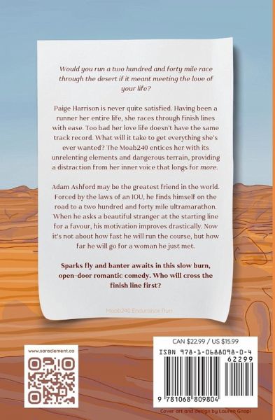 SEE YOU AT THE FINISH LINE is a coy, open door romance that's sure to have you kicking your feet and smiling. Two runners have an adorable meet cute at the staarting line of an ultramarathon. Is one race enough to fall in love? Would you run a two hundred and forty mile race through the desert if it meant meeting the love of your life? Paige Harrison is never quite satisfied. Having been a runner her entire life, she races through finish lines with ease. Too bad her love life doesn't have the same track record. What will it take to get everything she's ever wanted? The Moab240 entices her with its unrelenting elements and dangerous terrain, providing a distraction from her inner voice that longs for more. Adam Ashford may be the greatest friend in the world. Forced by the laws of an IOU, he finds himself on the road to a two hundred and forty mile ultramarathon. When he asks a beautiful stranger at the starting line for a favour, his motivation improves drastically. Now it's not about how fast he will run the course, but how far he will go for a woman he just met. Sparks fly and banter awaits in this slow burn, open-door romantic comedy. Who will cross the finish line first?