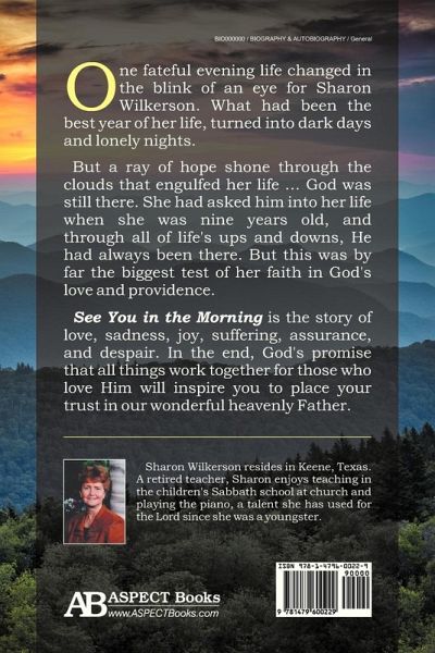 One fateful evening life changed in the blink of an eye for Sharon Wilkerson. What had been the best year of her life, turned into dark days and lonely nights. But a ray of hope shone through the clouds that engulfed her life ... God was still there. She had asked him into her life when she was nine years old, and through all of life's ups and downs, He had always been there. But this was by far the biggest test of her faith in God's love and providence. "See You in the Morning" is the story of love, sadness, joy, suffering, assurance, and despair. In the end, God's promise that all things work together for those who love Him will inspire you to place your trust in our wonderful heavenly Father.