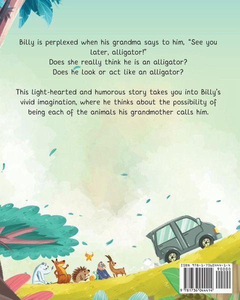 Looking for silly book that will help you bond with your child or grandchild in new and unique ways? This is it! In this book, Billy is perplexed when his grandma says to him, "See you later, Alligator!" Does she really think he is an alligator? Does he look or act like an alligator? This light-hearted and humorous story takes you into Billy's vivid imagination, where he thinks about all the possibilities of being each of the animals his grandmother calls him. Don't be surprised if after reading this book goodbyes with your child become a little less sad and a lot more cheerful!