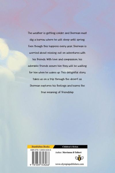 The weather is getting colder, and Sherman must dig a burrow where he will sleep until spring. Even though this happens every year, Sherman is worried about missing out on adventures with his friends. With love and compassion, his adorable friends assure him they will be waiting for him when he wakes up. This delightful story takes us on a trip through the desert as Sherman explores his feelings and learns the true meaning of friendship.