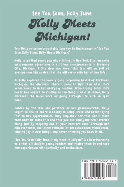 Join Holly on an unforgettable journey to Michigan in "See You Soon Holly June: Holly Meets Michigan!" Holly, a spirited young pup who still lives in New York City, embarks on a summer adventure to visit her grandpawrents in Traverse City, Michigan. Little does she know, this trip will be full of surprises and valuable life lessons. As Holly explores the beauty of Northern Michigan, she discovers that there's more to life than what she's accustomed to in the bustling city. From trying delicious cherries for the first time to experiencing the warmth of Michigan summers, Holly learns to embrace new experiences with an open heart. Guided by the love and patience of her grandpawrents, Holly begins to realize that there's beauty in diversity and that she should never say "no" to a new opportunity. Through her misadventures and newfound discoveries, she learns valuable lessons about acceptance, open-mindedness, and the joy of exploring new horizons. "See You Soon Holly June: Holly Meets Michigan!" is a heartwarming tale that will delight young readers and inspire them to embrace new experiences with curiosity and enthusiasm. Join Holly as she discovers the wonders of Michigan and learns valuable lessons about life, love, and the importance of keeping an open mind.
