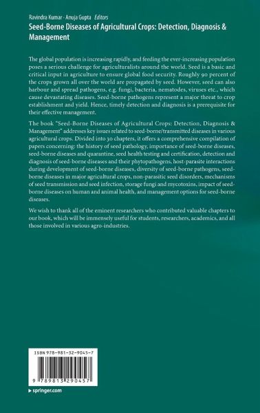 The global population is increasing rapidly, and feeding the ever-increasing population poses a serious challenge for agriculturalists around the world. Seed is a basic and critical input in agriculture to ensure global food security. Roughly 90 percent of the crops grown all over the world are propagated by seed. However, seed can also harbour and spread pathogens, e.g. fungi, bacteria, nematodes, viruses etc., which cause devastating diseases. Seed-borne pathogens represent a major threat to crop establishment and yield. Hence, timely detection and diagnosis is a prerequisite for their effective management. The book "Seed-Borne Diseases of Agricultural Crops: Detection, Diagnosis & Management" addresses key issues related to seed-borne/transmitted diseases in various agricultural crops. Divided into 30 chapters, it offers a comprehensive compilation of papers concerning: the history of seed pathology, importance of seed-borne diseases, seed-borne diseases and quarantine, seed health testing and certification, detection and diagnosis of seed-borne diseases and their phytopathogens, host-parasite interactions during development of seed-borne diseases, diversity of seed-borne pathogens, seed-borne diseases in major agricultural crops, non-parasitic seed disorders, mechanisms of seed transmission and seed infection, storage fungi and mycotoxins, impact of seed-borne diseases on human and animal health, and management options for seed-borne diseases. We wish to thank all of the eminent researchers who contributed valuable chapters to our book, which will be immensely useful for students, researchers, academics, and all those involved in various agro-industries.