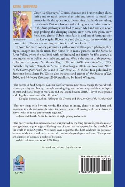 Known for her visionary paintings, Cynthia West is also a poet, photographer, digital imager and book artist. Her home, with many gardens, in the Santa Fe River Valley, where she has lived with her husband and family for fifty years, is a healing center as well as her studio and gallery. West is the author of six previous collections of poetry. For Beauty Way, 1990, and 1000 Stone Buddhas, 1993, published by Inked Wingbeat, Santa Fe. Rainbringer, 2004, The New Sun, 2007, In the Center of the Field, 2010, and A Clear Drop, 2015, the last four published by Sunstone Press, Santa Fe. West is also the artist and author of The Seasons of Tea, 2010, and Visionary Paintings, 2019, published by Inked Wingbeat.