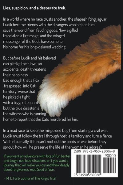Lies, suspicion, and a desperate trek. In a world where no race trusts another, the shapeshifting jaguar Ludik became friends with the strangers who helped him save the world from feuding gods. Now a gilled translator, a fire mage, and the winged messenger of the Gods have come to his home for his long-delayed wedding. But before Ludik and his beloved can pledge their love, an accidental death threatens their happiness. Bad enough that a Fox trespassed into Cat territory, worse that he picked a fight with a bigger Leopard, but the true disaster is the witness who is running home to report that the Cats murdered his kin. In a mad race to keep the misguided Dog from starting a civil war, Ludik must follow the trail through hostile territory and turn a fierce Wolf into an ally. If he can't root out the seeds of war before they sprout, how will he preserve the life of the woman he adores? Seed of War is the 2nd novel in the Unexpected Heroes series, a secondary world fantasy with shifters, mermaids, and winged people. If you enjoy mystery, danger, and justice, you'll love Seed of War.
