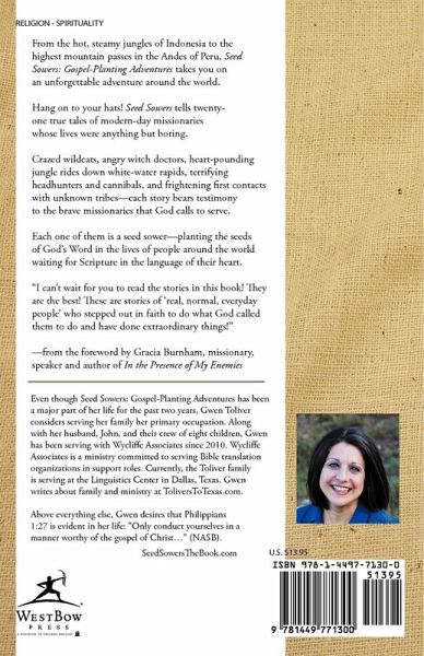 From the hot, steamy jungles of Indonesia to the highest mountain passes in the Andes of Peru, Seed Sowers: Gospel-Planting Adventures takes you on an unforgettable adventure around the world. Hang on to your hats! Seed Sowers tells twenty one true tales of modern-day missionaries whose lives were anything but boring. Crazed wildcats, angry witch doctors, heart pounding jungle rides down white-water rapids, terrifying headhunters and cannibals, and frightening first contacts with unknown tribes-each story bears testimony to the brave missionaries that God calls to serve. Each one of them is a seed sower-planting the seeds of God's Word in the lives of people around the world waiting for Scripture in the language of their heart. "I can't wait for you to read the stories in this book! They are the best! These are stories of 'real, normal, everyday people' who stepped out in faith to do what God called them to do and have done extraordinary things!" -from the foreword by Gracia Burnham, missionary, speaker and author of In the Presence of My Enemies