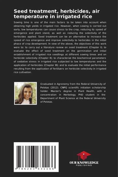 Sowing time is one of the main factors to be taken into account when obtaining high yields in irrigated rice. However, when sowing is carried out early, low temperatures can cause stress to the crop, reducing its speed of emergence and plant stand, as well as reducing the selectivity of the herbicides applied. Seed treatment can be an alternative to increase the speed of rice emergence and improve selectivity to herbicides in the initial phase of crop development. In view of the above, the objectives of this work were to: to carry out a literature review on seed treatment (Chapter I); to evaluate the effect of seed treatment on the germination and initial establishment of irrigated rice seedlings at different sowing times and on herbicide selectivity (Chapter II); to characterize the biochemical parameters of oxidative stress in irrigated rice subjected to low temperatures and the application of herbicides (Chapter III); and to evaluate the initial performance resulting from the application of fertilizers on herbicide selectivity in irrigated rice cultivation.