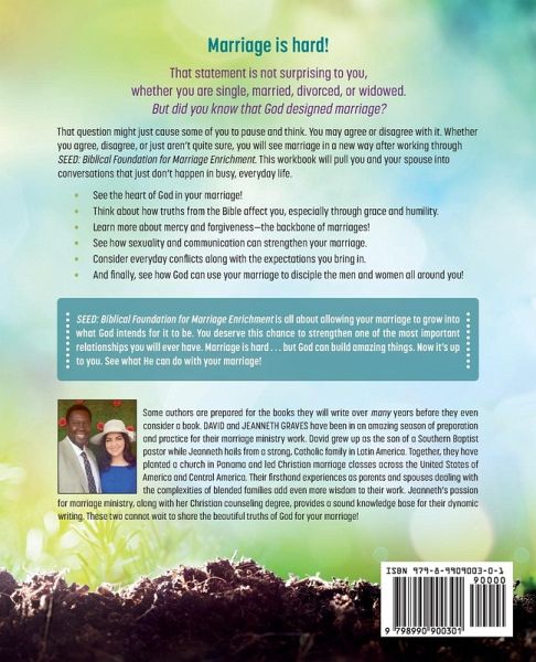 Marriage is hard! That statement is not surprising to you, whether you are single, married, divorced, or widowed. But did you know that God designed marriage? That question might just cause some of you to pause and think. You may agree or disagree with it. Whether you agree, disagree, or just aren't quite sure, you will see marriage in a new way after working through SEED: Biblical Foundation for Marriage Enrichment. This workbook will pull you and your spouse into conversations that just don't happen in busy, everyday life. · See the heart of God in your marriage! · Think about how truths from the Bible affect you, especially through grace and humility. · Learn more about mercy and forgiveness - the backbone of marriages! · See how sexuality and communication can strengthen your marriage. · Consider everyday conflicts along with the expectations you bring in. · And finally, see how God can use your marriage to disciple the men and women all around you! SEED: Biblical Foundation for Marriage Enrichment is all about allowing your marriage to grow into what God intends for it to be. You deserve this chance to strengthen one of the most important relationships you will ever have. Marriage is hard... but God can build amazing things. Now it's up to you. See what He can do with your marriage!