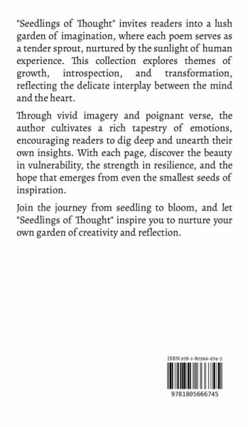 "Seedlings of Thought" invites readers into a lush garden of imagination, where each poem serves as a tender sprout, nurtured by the sunlight of human experience. This collection explores themes of growth, introspection, and transformation, reflecting the delicate interplay between the mind and the heart. Through vivid imagery and poignant verse, the author cultivates a rich tapestry of emotions, encouraging readers to dig deep and unearth their own insights. With each page, discover the beauty in vulnerability, the strength in resilience, and the hope that emerges from even the smallest seeds of inspiration. Join the journey from seedling to bloom, and let "Seedlings of Thought" inspire you to nurture your own garden of creativity and reflection.