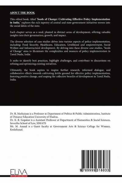 ABOUT THE BOOK This edited book, titled "Seeds of Change: Cultivating Effective Policy Implementation in India," explores the rich tapestry of central and state government initiatives woven into the social fabric of the state. Each chapter serves as a seed, planted in distinct areas of development, offering valuable insights into their germination, growth, and impact. The diverse selection of case studies delves into various aspects of policy implementation, including: Food Security, Healthcare, Education, Livelihood and empowerment, Social Welfare and Infrastructural development. By delving into these diverse case studies, "Seeds of Change" aims to illuminate the complexities and nuances of policy implementation in Tamil Nadu, India. It seeks to identify best practices, highlight challenges, and contribute to discussions on refining and optimizing existing initiatives. Ultimately, the book aspires to inspire further research, informed dialogue, and collaborative efforts towards cultivating fertile ground for effective policy implementation, fostering positive change, and reaping the collective benefits of development in Tamil Nadu, India.