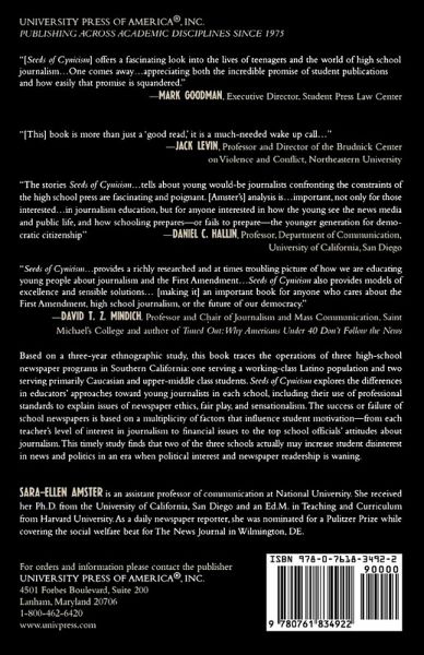 Based on a three-year ethnographic study, this book traces the operations of three high-school newspaper programs in Southern California: one serving a working-class Latino population and two serving primarily Caucasian and upper-middle class students. Seeds of Cynicism explores the differences in educators' approaches toward young journalists in each school, including their use of professional standards to explain issues of newspaper ethics, fair play, and sensationalism.