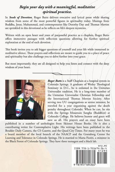 Begin your day with a meaningful, meditative spiritual practice. In Seeds of Devotion, Roger Butts delivers evocative and lyrical prose while sharing wisdom from some of the most powerful figures in spirituality today. Tidbits from Buddha, Jesus, Muhammad, and contemporaries like Dorothy Day and Thomas Merton are sprinkled in this devotional as he reflects on life's deepest mysteries. Written with an open heart and years of purposeful practice as a chaplain, Roger Butts offers immersive passages with Reflection questions allowing for further spiritual exploration at the end of each devotion. This book invites you to ask bigger questions of yourself and your life while immersed in meditative silence. These prayers and reflections are meant to guide you to a place of peace and spirituality but also challenge you to delve further into your grace.