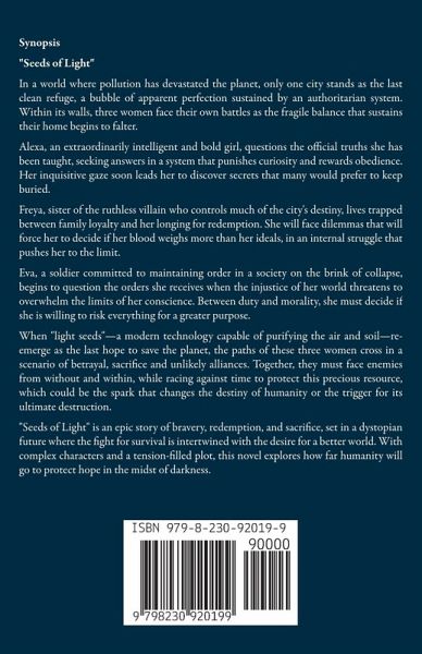 Synopsis "Seeds of Light" In a world where pollution has devastated the planet, only one city stands as the last clean refuge, a bubble of apparent perfection sustained by an authoritarian system. Within its walls, three women face their own battles as the fragile balance that sustains their home begins to falter. Alexa, an extraordinarily intelligent and bold girl, questions the official truths she has been taught, seeking answers in a system that punishes curiosity and rewards obedience. Her inquisitive gaze soon leads her to discover secrets that many would prefer to keep buried. Freya, sister of the ruthless villain who controls much of the city's destiny, lives trapped between family loyalty and her longing for redemption. She will face dilemmas that will force her to decide if her blood weighs more than her ideals, in an internal struggle that pushes her to the limit. Eva, a soldier committed to maintaining order in a society on the brink of collapse, begins to question the orders she receives when the injustice of her world threatens to overwhelm the limits of her conscience. Between duty and morality, she must decide if she is willing to risk everything for a greater purpose. When "light seeds"-a modern technology capable of purifying the air and soil-re-emerge as the last hope to save the planet, the paths of these three women cross in a scenario of betrayal, sacrifice and unlikely alliances. Together, they must face enemies from without and within, while racing against time to protect this precious resource, which could be the spark that changes the destiny of humanity or the trigger for its ultimate destruction. "Seeds of Light" is an epic story of bravery, redemption, and sacrifice, set in a dystopian future where the fight for survival is intertwined with the desire for a better world. With complex characters and a tension-filled plot, this novel explores how far humanity will go to protect hope in the midst of darkness.