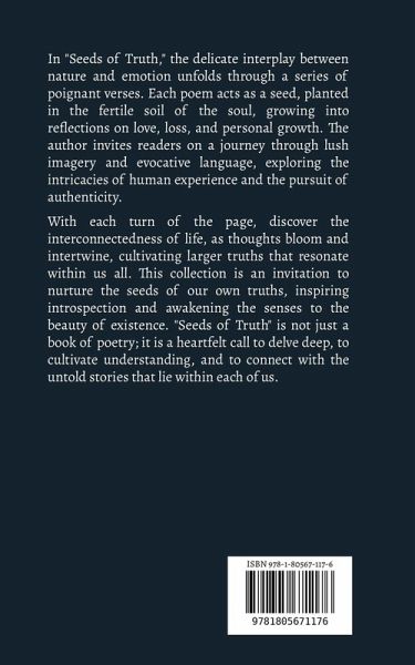In "Seeds of Truth," the delicate interplay between nature and emotion unfolds through a series of poignant verses. Each poem acts as a seed, planted in the fertile soil of the soul, growing into reflections on love, loss, and personal growth. The author invites readers on a journey through lush imagery and evocative language, exploring the intricacies of human experience and the pursuit of authenticity. With each turn of the page, discover the interconnectedness of life, as thoughts bloom and intertwine, cultivating larger truths that resonate within us all. This collection is an invitation to nurture the seeds of our own truths, inspiring introspection and awakening the senses to the beauty of existence. "Seeds of Truth" is not just a book of poetry; it is a heartfelt call to delve deep, to cultivate understanding, and to connect with the untold stories that lie within each of us.