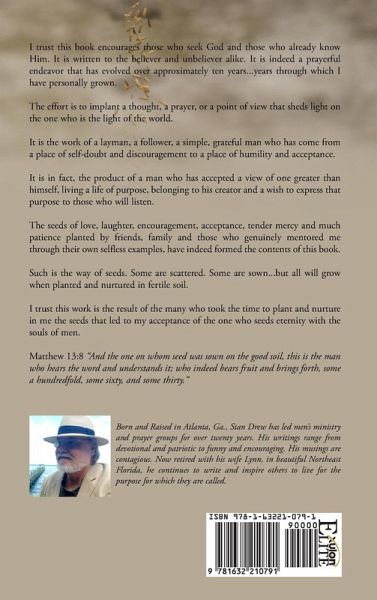 I trust this book encourages those who seek God and those who already know Him. It is written to the believer and unbeliever alike. It is indeed a prayerful endeavor that has evolved over approximately ten years...years through which I have personally grown.The effort is to implant a thought, a prayer, or a point of view that sheds light on the one who is the light of the world.It is the work of a layman, a follower, a simple, grateful man who has come from a place of self-doubt and discouragement to a place of humility and acceptance.It is in fact, the product of a man who has accepted a view of one greater than himself, living a life of purpose, belonging to his creator and a wish to express that purpose to those who will listen.The seeds of love, laughter, encouragement, acceptance, tender mercy and much patience planted by friends, family and those who genuinely mentored me through their own selfless examples, have indeed formed the contents of this book.Such is the way of seeds. Some are scattered. Some are sown...but all will grow when planted and nurtured in fertile soil.I trust this work is the result of the many who took the time to plant and nurture in me the seeds that led to my acceptance of the one who seeds eternity with the souls of men.Matthew 13:8 “And the one on whom seed was sown on the good soil, this is the man who hears the word and understands it; who indeed bears fruit and brings forth, some a hundredfold, some sixty, and some thirty.”