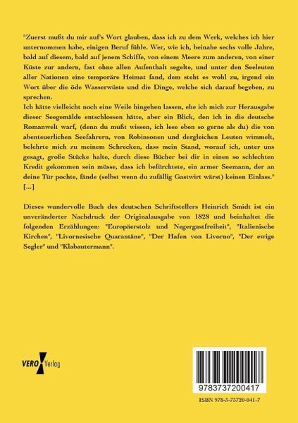 Dieses wundervolle Buch des deutschen Schriftstellers Heinrich Smidt ist ein unveränderter Nachdruck der Originalausgabe von 1828 und beinhaltet die folgenden Erzählungen: "Europäerstolz und Negergastfreiheit", "Italienische Kirchen", "Livornesische Quarantäne", "Der Hafen von Livorno", "Der ewige Segler" und "Klabautermann".
