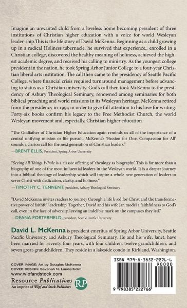 Imagine an unwanted child from a loveless home becoming president of three institutions of Christian higher education with a voice for world Wesleyan leader-ship.This is the life story of David McKenna. Beginning as a child growing up in a radical Holiness tabernacle, he survived that experience,, enrolled in a Christian college, discovered the healthy meaning of holiness, achieved the highest academic degree, and received his calling to ministry. As the youngest college president in the nation, he took Spring Arbor Junior College to a four-year Christian liberal arts institution. The call then came to the presidency of Seattle Pacific College, where financial crisis required turnaround management before advancing to status as a Christian university. God's call then took McKenna to the presidency of Asbury Theological Seminary, renowned among seminaries for both biblical preaching and world missions in its Wesleyan heritage. McKenna retired from the presidency in 1994 in order to give full attention to his love for writing. Forty-six books confirm his legacy to the Free Methodist Church, the world Wesleyan movement and, especially, Christian higher education.