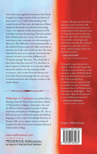 Description: One of the most significant features of the Fourth Gospel is its unique version of the crucifixion of Jesus (19:12-42). A full understanding of the central section of this scene, the depiction of Jesus' death and the details immediately surrounding (19:31-37), depends on the interpretation of the verse that recounts the piercing of his side and the ¿ow of blood and water (19:34). Yet, there has never been a clear consensus as to the meaning of this verse. This difficulty is not insurmountable, as the solution becomes apparent when one lends an attentive ear to the voice of the narrator. The event described in verse 34 is explicitly declared by the narrator in verse 37 to be the fulfillment of a ""Scripture passage"" that says, ""They shall look at him whom they have pierced."" It is, therefore, to that Scripture, Zechariah 12:10, that the author directs his audience for the meaning of this occurrence, and it is then from the literary context of the Zechariah passage that we can come to understand better this Gospel's account of the death of Jesus. Endorsements: ""Readers will appreciate the clarity, coherence, and conciseness with which Carnazzo presents his new interpretation of the climactic scene of seeing blood and water flowing from the side of the crucified Jesus. His narrative-critical approach, that takes seriously the scriptural background, opens the way for a deeper understanding of these key Johannine symbols."" --John Paul Heil, The Catholic University of America ""Among the many interpretative enigmas of the Fourth Gospel that continue to resist clarification is the statement in John 19:34 that blood and water flowed from the pierced side of the crucified Jesus. Carnazzo's concise study provides an excellent overview of scholarly discussion, from the Patristic era to contemporary scholarship . . . This rich study will guide all interested in a vexed Johannine question."" --Francis J. Moloney, Australian Catholic University About the Contributor(s): Sebastian A. Carnazzo received his MA in theology from the Notre Dame Graduate School of Christendom College in Alexandria, VA, and his PhD in biblical studies from the Catholic University of America in Washington, DC. He is a full-time lecturer in Sacred Scripture and biblical languages at Our Lady of Guadalupe Seminary in Denton, NE, and an adjunct lecturer in Sacred Scripture for the Notre Dame Graduate School of Christendom College.