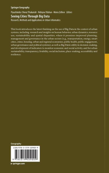 Introduction to Seeing Cities Through Big Data - Research, Methods, and Applications in Urban Informatics.- Big Data and Urban Informatics: Innovations and Challenges to Urban Planning and Knowledge Discovery.- Analytics of user-generated content.- Using User-Generated Content to Understand Cities.- Developing an Interactive Mobile Volunteered Geographic Information Platform to Integrate Environmental Big Data and Citizen Science in Urban Management.- CyberGIS-enabled Urban Sensing from Volunteered Citizen Participation Using Mobile Devices.- Challenges and opportunities of urban Big Data.- The Potential for Big Data to Improve Neighborhood-Level Census Data.- Big Data and Survey Research: Supplement or Substitute?.- Big Spatio-temporal Network Data Analytics for Smart Cities: Research Needs.- A review of heteroscedasticity treatment with Gaussian Processes and Quantile Regression meta-models.- Changing organizational and educational perspectives with urban Big Data.- Urban Informatics: Critical Data and Technology Considerations.- Emerging Urban Digital Infomediaries and Civic Hacking in an Era of Big Data and Open Data Initiatives.- How Should Urban Planners Be Trained to Handle Big Data?.- Energy Planning in Big data Era: A Theme Study of the Residential Sector.- Urban data management.- Using an online spatial analytics workbench for understanding housing affordability in Sydney.- A Big Data Mashing Tool for Measuring Transit System Performance.- Developing a Comprehensive U.S. Transit Accessibility Database.- Seeing Chinese Cities through Big Data and Statistics.- Urban knowledge discovery applied to different urban contexts.- Planning for the Change: Mapping Sea Level Rise and Storm Inundation in Sherman Island Using 3Di Hydrodynamic Model and LiDAR.- The Impact of Land-Use Variables on Free-floating Carsharing Vehicle Rental Choice and Parking Duration.- Dynamic Agent Based Simulation of an Urban Disaster Using Synthetic Big Data.- Estimation of Urban Transport Accessibility at the Spatial Resolution of an Individual Traveler.- Modeling Taxi Demand and Supply in New York City Using Large-Scale Taxi GPS Data.- Detecting stop episodes from GPS trajectories with gaps.- Emergencies and Crisis.- Using Social Media and Satellite Data for Damage Assessment in Urban Areas During Emergencies.- Health and well-being.- 'Big Data': Pedestrian Volume Using Google Street View Images.- Learning from Outdoor Webcams: Surveillance of Physical Activity Across Environments.- Mapping Urban Soundscapes via Citygram.- Social equity and data democracy.- Big Data and Smart (Equitable) Cities.- Big Data, Small Apps: Premises and Products of the Civic Hackathon.