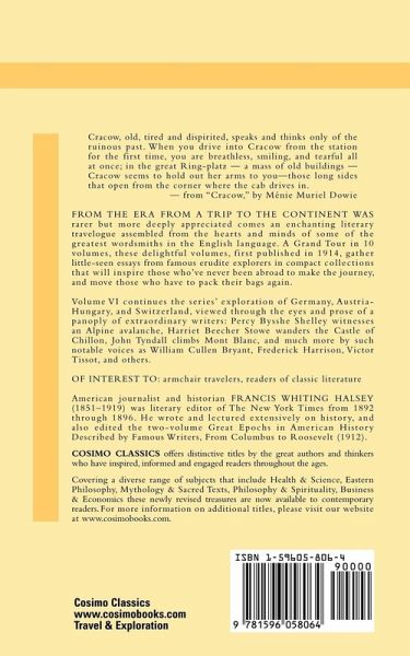 Cracow, old, tired and dispirited, speaks and thinks only of the ruinous past. When you drive into Cracow from the station for the first time, you are breathless, smiling, and tearful all at once; in the great Ring-platz-a mass of old buildings-Cracow seems to hold out her arms to you-those long sides that open from the corner where the cab drives in. - from "Cracow," by Ménie Muriel Dowie From the era from a trip to the Continent was rarer but more deeply appreciated comes an enchanting literary travelogue assembled from the hearts and minds of some of the greatest wordsmiths in the English language. A Grand Tour in 10 volumes, these delightful volumes, first published in 1914, gather little-seen essays from famous erudite explorers in compact collections that will inspire those who've never been abroad to make the journey, and move those who have to pack their bags again. Volume VI continues the series' exploration of Germany, Austria-Hungary, and Switzerland, viewed through the eyes and prose of a panoply of extraordinary writers: Percy Bysshe Shelley witnesses an Alpine avalanche, Harriet Beecher Stowe wanders the Castle of Chillon, John Tyndall climbs Mont Blanc, and much more by such notable voices as William Cullen Bryant, Frederick Harrison, Victor Tissot, and others. Beautifully illustrated with charming photographs, it is a work to treasure... and to take along on your next trip. OF INTEREST TO: armchair travelers, readers of classic literature American journalist and historian FRANCIS WHITING HALSEY (1851-1919) was literary editor of The New York Times from 1892 through 1896. He wrote and lectured extensively on history, and also edited the two-volume Great Epochs in American History Described by Famous Writers, From Columbus to Roosevelt (1912).