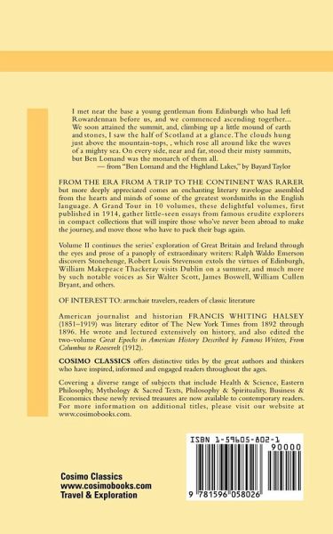 I met near the base a young gentleman from Edinburgh who had left Rowardennan before us, and we commenced ascending together... We soon attained the summit, and, climbing up a little mound of earth and stones, I saw the half of Scotland at a glance. The clouds hung just above the mountain-tops, , which rose all around like the waves of a mighty sea. On every side, near and far, stood their misty summits, but Ben Lomand was the monarch of them all. -from "Ben Lomand and the Highland Lakes," by Bayard Taylor From the era from a trip to the Continent was rarer but more deeply appreciated comes an enchanting literary travelogue assembled from the hearts and minds of some of the greatest wordsmiths in the English language. A Grand Tour in 10 volumes, these delightful volumes, first published in 1914, gather little-seen essays from famous erudite explorers in compact collections that will inspire those who've never been abroad to make the journey, and move those who have to pack their bags again. Volume II continues the series' exploration of Great Britain and Ireland through the eyes and prose of a panoply of extraordinary writers: Ralph Waldo Emerson discovers Stonehenge, Robert Louis Stevenson extols the virtues of Edinburgh, William Makepeace Thackeray visits Dublin on a summer, and much more by such notable voices as Sir Walter Scott, James Boswell, William Cullen Bryant, and others. Beautifully illustrated with charming photographs, it is a work to treasure... and to take along on your next trip. OF INTEREST TO: armchair travelers, readers of classic literature American journalist and historian FRANCIS WHITING HALSEY (1851-1919) was literary editor of The New York Times from 1892 through 1896. He wrote and lectured extensively on history, and also edited the two-volume Great Epochs in American History Described by Famous Writers, From Columbus to Roosevelt (1912).