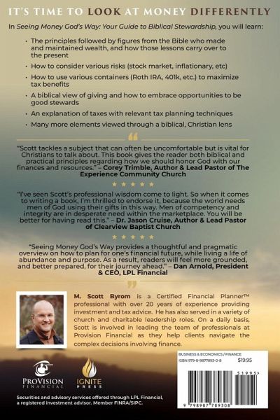It's Time to Look at Money Differently In Seeing Money God's Way: Your Guide to Biblical Stewardship, you will learn: The principles followed by figures from the Bible who made and maintained wealth, and how those lessons carry over to the present How to consider various risks (stock market, inflationary, etc.) How to use various containers (Roth IRA, 401k, etc.) to maximize tax benefits A biblical view of giving and how to embrace opportunities to be good stewards An explanation of taxes with relevant tax planning techniques Many more elements viewed through a biblical, Christian lens
