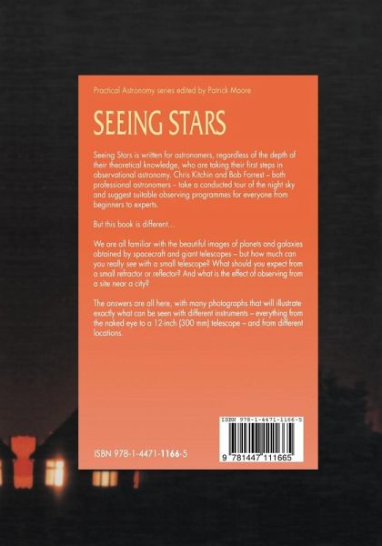 Seeing Stars is written for astronomers, regardless of the depth of their theoretical knowledge, who are taking their first steps in observational astronomy. Chris Kitchin and Bob Forrest - both professional astronomers - take a conducted tour of the night sky and suggest suitable observing programmes for everyone from beginners to experts. How is this book different? We are all familiar with the beautiful images of planets and galaxies obtained by spacecraft and giant telescopes - but what can you really see with a small telescope? What should you expect from a small refractor or reflector? And what is the effect of observing from a site near a city? The answers are all here, with many photographs that will illustrate exactly what can be seen with different instruments (everything from the naked eye to a 300mm telescope) - and from different locations.