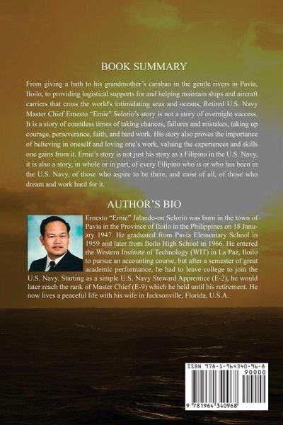 From giving a bath to his grandmother's carabao in the gentle rivers in Pavia, Iloilo, to providing logistical supports for and helping maintain ships and aircraft carriers that cross the world's intimidating seas and oceans, Retired U.S. Navy Master Chief Ernesto "Ernie" Selorio's story is not a story of overnight success. It is a story of countless times of taking chances, failures and mistakes, taking up courage, perseverance, faith, and hard work. His story also proves the importance of believing in oneself and loving one's work, valuing the experiences and skills one gains from it. Ernie's story is not just his story as a Filipino in the U.S. Navy, it is also a story, in whole or in part, of every Filipino who is or who has been in the U.S. Navy, of those who aspire to be there, and most of all, of those who dream and work hard for it.