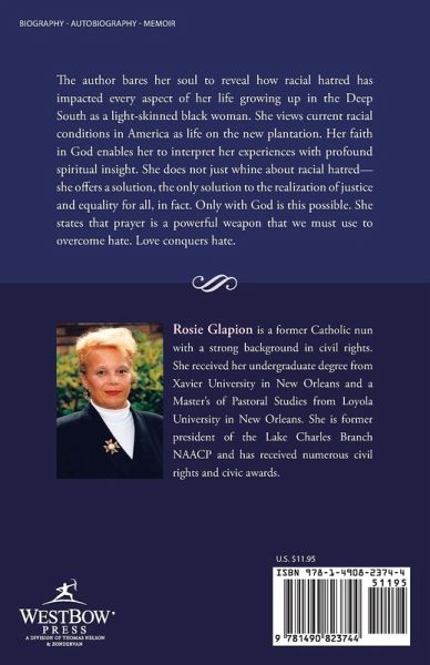 The author bares her soul to reveal how racial hatred has impacted every aspect of her life growing up in the Deep South as a light-skinned black woman. She views current racial conditions in America as life on the new plantation. Her faith in God enables her to interpret her experiences with profound spiritual insight. She does not just whine about racial hatred-she offers a solution, the only solution to the realization of justice and equality for all, in fact. Only with God is this possible. She states that prayer is a powerful weapon that we must use to overcome hate. Love conquers hate.