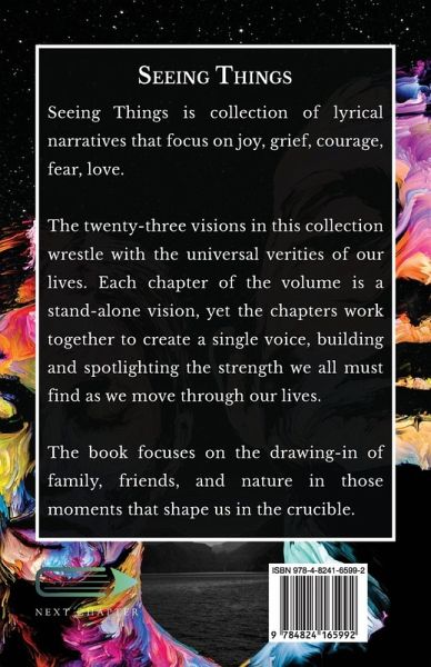 Seeing Things is collection of lyrical narratives that focus on joy, grief, courage, fear, love. The twenty-three visions in this collection wrestle with the universal verities of our lives. Each chapter of the volume is a stand-alone vision, yet the chapters work together to create a single voice, building and spotlighting the strength we all must find as we move through our lives. The book focuses on the drawing-in of family, friends, and nature in those moments that shape us in the crucible.