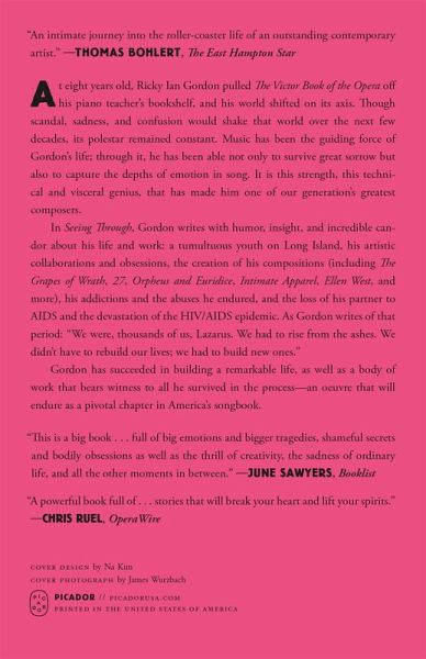 The true confessions of a working opera composer: an exhilarating story of "a life that comes out of chaos." At eight years old, Ricky Ian Gordon pulled The Victor Book of Opera off his piano teacher's bookshelf, and his world shifted on its axis. Though scandal, sadness, and confusion would shake that world over the next few decades, its polestar remained constant. Music has been the guiding force of Gordon's life; through it, he has been able not only to survive great sorrow but also to capture the depths of his emotion in song. It is this strength, this technical and visceral genius, that has made him one of our generation's greatest composers. In Seeing Through, Gordon writes with humor, insight, and incredible candor about his life and work: a tumultuous youth on Long Island, his artistic collaborations and obsessions, the creation of his compositions (including The Grapes of Wrath, 27, Orpheus and Euridice, Intimate Apparel, Ellen West , and more), his addictions and the abuses he endured, and the loss of his partner to AIDS and the devastation of the HIV/AIDS epidemic. As Gordon writes of that period: "We were, thousands of us, Lazarus. We had to rise from the ashes. We didn't have to rebuild our lives, we had to build new ones." Gordon has succeeded in building a remarkable life, as well as a body of work that bears witness to all he survived in the process-one that will endure as a pivotal chapter in America's songbook.