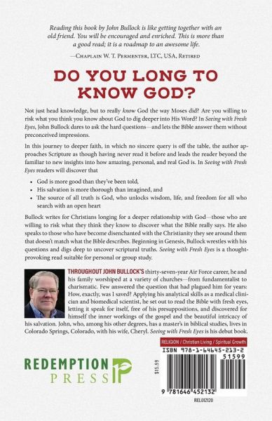 Reading this book by John Bullock is like getting together with an old friend. You will be encouraged and enriched. This is more than a good read; it is a roadmap to an awesome life. ¿Chaplain W. T. Permenter, LTC, USA, Retired Do you long to know God? Not just head knowledge, but to really know God the way Moses did? Are you willing to risk what you think you know about God to dig deeper into His Word? In Seeing with Fresh Eyes, John Bullock dares to ask the hard questions-and lets the Bible answer them without preconceived impressions. In this journey to deeper faith, in which no sincere query is off the table, the author approaches Scripture as though having never read it before and leads the reader beyond the familiar to new insights into how amazing, personal, and real God is. In Seeing with Fresh Eyes readers will discover that God is more good than they've been told, His salvation is more thorough than imagined, and the source of all truth is God, who unlocks wisdom, life, and freedom for all who search with an open heart Bullock writes for Christians longing for a deeper relationship with God-those who are willing to risk what they think they know to discover what the Bible really says. He also speaks to those who have become disenchanted with the Christianity they see around them that doesn't match what the Bible describes. Beginning in Genesis, Bullock wrestles with his questions and digs deep to uncover scriptural truths. Seeing with Fresh Eyes is a thought-provoking read suitable for personal or group study.