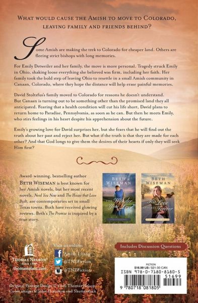 What would cause the Amish to move to Colorado, leaving family and friends behind? Some Amish are making the trek to Colorado for cheaper land. Others are fleeing strict bishops with long memories. For Emily Detweiler and her family, the move is more personal. Tragedy struck Emily in Ohio, shaking loose everything she believed was firm, including her faith. Her family took the bold step of leaving Ohio to resettle in a small Amish community in Canaan, Colorado, where they hope the distance will help erase painful memories. David Stoltzfus's family moved to Colorado for reasons he doesn't understand. But Canaan is turning out to be something other than the promised land they all anticipated. Fearing that a health condition will cut his life short, David plans to return home to Paradise, Pennsylvania, as soon as he can. But then he meets Emily, who stirs feelings in his heart despite his apprehension about the future. Emily's growing love for David surprises her, but she fears that he will find out the truth about her past and reject her. But what if the truth is that they are made for each other? And that God longs to give them the desires of their hearts if only they will seek Him first?