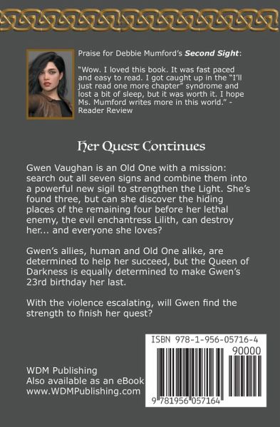 Gwen Vaughan is an Old One with a mission: search out all seven signs and combine them into a powerful new sigil to strengthen the Light. She's found three, but can she discover the hiding places of the remaining four before her lethal enemy, the evil enchantress Lilith, can destroy her… and everyone she loves? Gwen's allies, human and Old One alike, are determined to help her succeed, but the Queen of Darkness is equally determined to make Gwen's 23rd birthday her last. With the violence escalating, will Gwen find the strength to finish her quest?