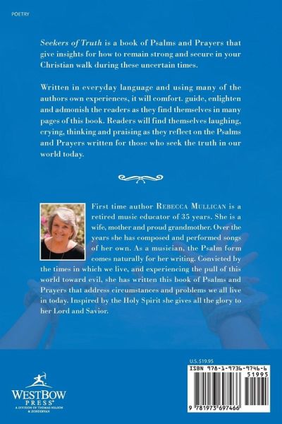 Seekers of Truth is a book of Psalms and Prayers that give insights for how to remain strong and secure in your Christian walk during these uncertain times. Written in everyday language and using many of the authors own experiences, it will comfort. guide, enlighten and admonish the readers as they find themselves in many pages of this book. Readers will find themselves laughing, crying, thinking and praising as they reflect on the Psalms and Prayers written for those who seek the truth in our world today.