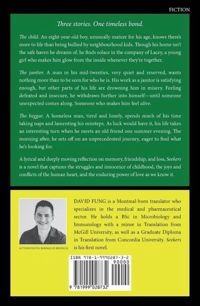 Three stories. One timeless bond. The child. An eight-year-old boy, unusually mature for his age, knows there's more to life than being bullied by neighbourhood kids. Though his home isn't the safe haven he dreams of, he finds solace in the company of Lacey, a young girl who makes him glow from the inside whenever they're together. The janitor. A man in his mid-twenties, very quiet and reserved, wants nothing more than to be seen for who he is. His work as a janitor is satisfying enough, but other parts of his life are drowning him in misery. Feeling defeated and insecure, he withdraws further into himself-until someone unexpected comes along. Someone who makes him feel alive. The beggar. A homeless man, tired and lonely, spends much of his time taking naps and lamenting his missteps. As luck would have it, his life takes an interesting turn when he meets an old friend one summer evening. The morning after, he sets off on an unprecedented journey, eager to find what he's looking for. A lyrical and deeply moving reflection on memory, friendship, and loss, Seekers is a novel that captures the struggles and innocence of childhood, the joys and conflicts of the human heart, and the enduring power of love as we know it.