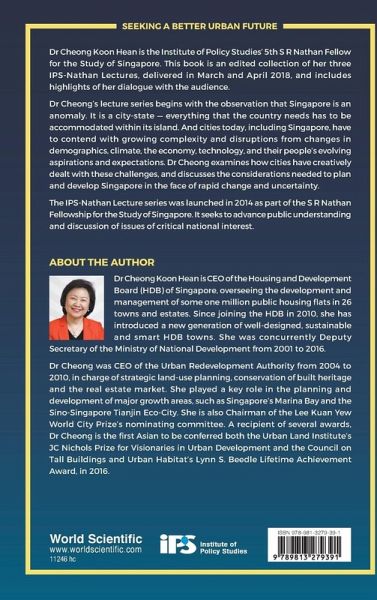Dr Cheong Koon Hean, CEO of the Housing and Development Board (2010–Present) was the Institute of Policy Studies' 5th S R Nathan Fellow for the Study of Singapore. This book contains edited versions of the three IPS-Nathan Lectures she gave between March and April 2018, and highlights of her dialogue with the audience. Climate change, an ageing population, anti-globalisation sentiments the world over, technological disruption, and social media all pose unique problems and opportunities to cities. Dr Cheong examines how cities deal with their urban challenges to create a better life for their citizens. In particular, what are the considerations needed to plan and develop Singapore in the face of rapid change and uncertainty, given our constraints as a small city-state with an open economy? The IPS-Nathan Lectures series was launched in 2014 as part of the S R Nathan Fellowship for the Study of Singapore. The S R Nathan Fellow delivers a series of lectures during their term to advance public understanding and discussion of issues of critical national interest.
