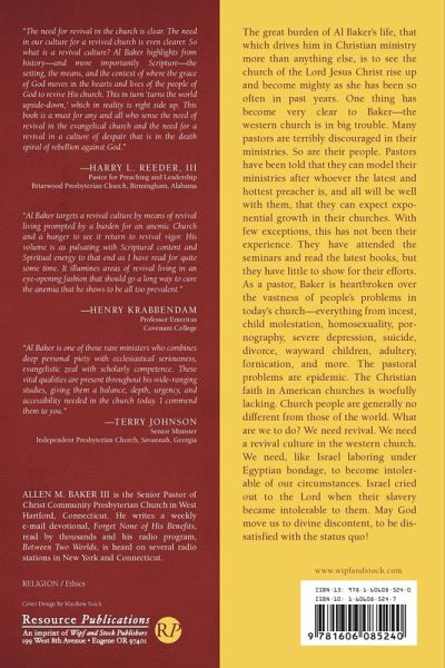 The great burden of Al Baker's life, that which drives him in Christian ministry more than anything else, is to see the church of the Lord Jesus Christ rise up and become mighty as she has been so often in past years. One thing has become very clear to Baker--the western church is in big trouble. Many pastors are terribly discouraged in their ministries. So are their people. Pastors have been told that they can model their ministries after whoever the latest and hottest preacher is, and all will be well with them, that they can expect exponential growth in their churches. With few exceptions, this has not been their experience. They have attended the seminars and read the latest books, but they have little to show for their efforts. As a pastor, Baker is heartbroken over the vastness of people's problems in today's church--everything from incest, child molestation, homosexuality, pornography, severe depression, suicide, divorce, wayward children, adultery, fornication, and more. The pastoral problems are epidemic. The Christian faith in American churches is woefully lacking. Church people are generally no different from those of the world. What are we to do? We need revival. We need a revival culture in the western church. We need, like Israel laboring under Egyptian bondage, to become intolerable of our circumstances. Israel cried out to the Lord when their slavery became intolerable to them. May God move us to divine discontent, to be dissatisfied with the status quo!