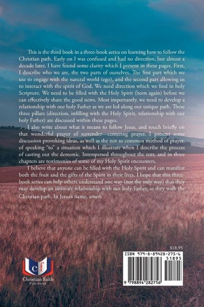 This is the third book in a three-book series on learning how to follow the Christian path. Early on I was confused and had no direction, but almost a decade later, I have found some clarity which I present in these pages. First, I describe who we are, the two parts of ourselves. The first part which we use to engage with the natural world (ego), and the second part allowing us to interact with the spirit of God. We need direction which we find in holy Scripture. We need to be filled with the Holy Spirit (born again) before we can effectively share the good news. Most importantly, we need to develop a relationship with our holy Father as we are led along our unique path. These three pillars (direction, infilling with the Holy Spirit, relationship with our holy Father) are discussed within these pages. I also write about what it means to follow Jesus, and touch briefly on that wonderful prayer of surrender--centering prayer. I present some discussion provoking ideas, as well as the not so common method of prayer, of speaking "to" a situation which I illustrate when I describe the process of casting out the demonic. Interspersed throughout the text, and in three chapters are testimonies of some of my Holy Spirit encounters. I believe that anyone can be filled with the Holy Spirit and can manifest both the fruit and the gifts of the Spirit in their lives. I hope that this three-book series can help others understand one way (not the only way) that they may develop an intimate relationship with our holy Father, as they walk the Christian path. In Jesus's name, amen.