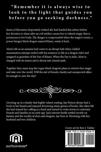 "Remember it is always wise to look to the light that guides you before you go seeking darkness." Jenna of Moontree desperately wished she had heeded this advice before her decision to chase after an evil artifact causes her to inherit magic that is poisonous to her body. The danger is compounded when the magic's owner, a power hungry black dragon named Kitara, wants it back. Alexi's life as an assassin had come to an abrupt halt when a failed assassination attempt ended with his sentence to life as a dragon rider and assigned as guardian of the Eye of Kitara. When the Eye is stole, Alexi is charged with its return and is thrust into Jenna's path. Together they must stop the rogue black dragon's plans to retrieve her magic and take over the world. Will the aid of friends, family and unexpected allies be enough to save the day?