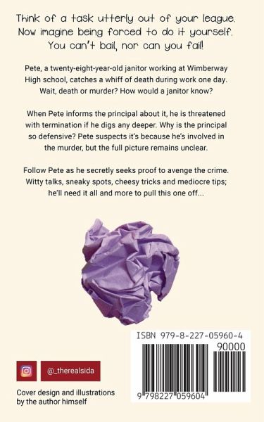 Think of a task utterly out of your league. Now imagine being forced to do it. You can't bail, nor can you fail! Pete, a twenty-eight-year-old janitor working at Wimberway High school, catches a whiff of death during work one day. Wait, death or murder? How would a janitor know? When Pete informs the principal about it, he is threatened with termination if he digs any deeper. Why is the principal so defensive? Pete suspects it's because he's involved in the murder, but the full picture remains unclear. Follow Pete as he secretly seeks proof to avenge the crime. Witty talks, sneaky spots, cheesy tricks and mediocre tips; he'll need it all and more to pull this one off...