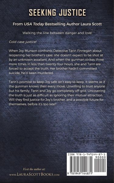 From USA Today Bestselling Author Laura Scott Walking the line between danger and love! Cold case justice! When Joy Munson confronts Detective Tarin Finnegan about reopening her brother's case, she doesn't expect to be shot at by an unknown assailant. And when the gunman strikes three more times in less than twenty-four hours, she and Tarin are forced to accept the truth. Her brother hadn't committed suicide, he'd been murdered. Tarin's promise to keep Joy safe isn't easy to keep. It seems as if the gunman knows their every move. Unwilling to trust anyone but his family, Tarin and Joy go completely off-grid. Uncovering the truth is just as difficult as ignoring their mutual attraction. Will they find justice for Joy's brother, and a possible future for themselves, before it's too late?