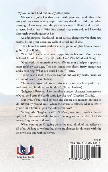 "My soul cannot find rest on any other path." My name is John Goodwill, and, with grandson Frank, this is the story of our cross-country trip to find my daughter, Faith. Forty-five years ago, I ran away from the pain of her mental illness and live with a secret, broken heart. Faith just turned sixty years old, and I wonder absolutely everything about her. As a fun surprise, Frank and I meet curious characters who share raw truths, helping tear down my walls of denial and shame. "This homeless artist is like shattered pieces of glass from a broken goblet" (Just Bob). "She didn't know what was happening to her son. Mom always believed I could learn to live with who I am" (Sea Wind and Gang). "God works in mysterious ways. We are sent a helper, support in most unlikely packages. This one comes with short, frizzy orange hair and a nose ring. What else could I need?" (Josie). "The cure is a shot in the eye? Not for me! Get my pants, Frank, we are out of here" (Grandfather). "We get to a crossroad. We can give our dreams one final push. Then we know deep inside we are finished" (Nurse Hatchett). "Judgment? To some, I look more like a cartoon character than a servant of God, yet I carry the Lord's spirit, just like you" (Chaplain Charlie). Our lives, if you could go back and choose one moment in time to do differently, would you? When the storm is calmed, what is left in your clear reflection upon the still waters now? Seeking My Daughter Faith: Parables from The Forgotten details spiritual adventures of the forgotten among us and stories of God's mercy, forgiveness, and love. When you see an RV going down the road, think of me, reflect on all of us. As long as we breathe, there are chances for do-overs with the ones we love and with ourselves.