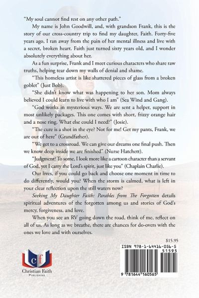 "My soul cannot find rest on any other path." My name is John Goodwill, and, with grandson Frank, this is the story of our cross-country trip to find my daughter, Faith. Forty-five years ago, I ran away from the pain of her mental illness and live with a secret, broken heart. Faith just turned sixty years old, and I wonder absolutely everything about her. As a fun surprise, Frank and I meet curious characters who share raw truths, helping tear down my walls of denial and shame. "This homeless artist is like shattered pieces of glass from a broken goblet" (Just Bob). "She didn't know what was happening to her son. Mom always believed I could learn to live with who I am" (Sea Wind and Gang). "God works in mysterious ways. We are sent a helper, support in most unlikely packages. This one comes with short, frizzy orange hair and a nose ring. What else could I need?" (Josie). "The cure is a shot in the eye? Not for me! Get my pants, Frank, we are out of here" (Grandfather). "We get to a crossroad. We can give our dreams one final push. Then we know deep inside we are finished" (Nurse Hatchett). "Judgment? To some, I look more like a cartoon character than a servant of God, yet I carry the Lord's spirit, just like you" (Chaplain Charlie). Our lives, if you could go back and choose one moment in time to do differently, would you? When the storm is calmed, what is left in your clear reflection upon the still waters now? Seeking My Daughter Faith: Parables from The Forgotten details spiritual adventures of the forgotten among us and stories of God's mercy, forgiveness, and love. When you see an RV going down the road, think of me, reflect on all of us. As long as we breathe, there are chances for do-overs with the ones we love and with ourselves. 1