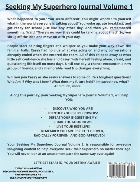 SEEKING MY SUPERHERO JOURNAL VOLUME 1 What happened to you? You seem different! You might wonder---what in the world everyone is talking about? You woke up, ate breakfast, and got ready for school just like any other day. And then you remembered something. Wait! "There's no way they could be talking about that!" So, you shrug off the idea and move on with your day.People start pointing fingers and whisper as you make your way down the familiar halls. Casey had no clue what was going on and why conversations abruptly ended when she entered the room. All of this chipped away at what little self-confidence she had and Casey found herself feeling alone, afraid, and questioning life itself on most days. Until one day, a chance encounter, a new group of friends, and a memorable road trip changed everything.