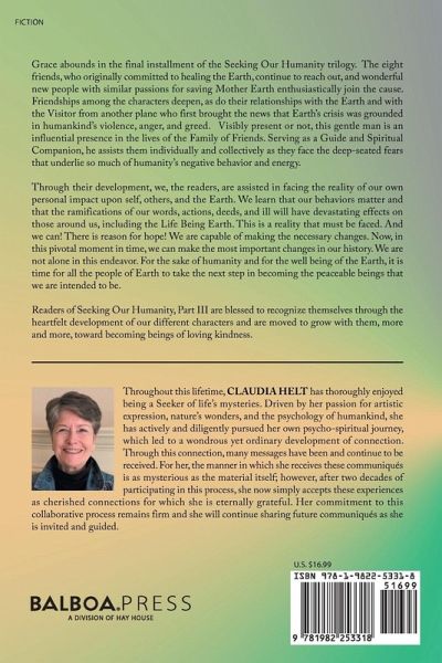 Grace abounds in the final installment of the Seeking Our Humanity trilogy. The eight friends, who originally committed to healing the Earth, continue to reach out, and wonderful new people with similar passions for saving Mother Earth enthusiastically join the cause. Friendships among the characters deepen, as do their relationships with the Earth and with the Visitor from another plane who first brought the news that Earth's crisis was grounded in humankind's violence, anger, and greed. Visibly present or not, this gentle man is an influential presence in the lives of the Family of Friends. Serving as a Guide and Spiritual Companion, he assists them individually and collectively as they face the deep-seated fears that underlie so much of humanity's negative behavior and energy. Through their development, we, the readers, are assisted in facing the reality of our own personal impact upon self, others, and the Earth. We learn that our behaviors matter and that the ramifications of our words, actions, deeds, and ill will have devastating effects on those around us, including the Life Being Earth. This is a reality that must be faced. And we can! There is reason for hope! We are capable of making the necessary changes. Now, in this pivotal moment in time, we can make the most important changes in our history. We are not alone in this endeavor. For the sake of humanity and for the well being of the Earth, it is time for all the people of Earth to take the next step in becoming the peaceable beings that we are intended to be. Readers of Seeking Our Humanity, Part III are blessed to recognize themselves through the heartfelt development of our different characters and are moved to grow with them, more and more, toward becoming beings of loving kindness.